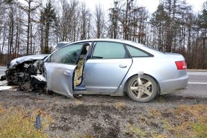 Na drodze krajowej w Styrzyńcu kierowca audi zjechał na lewy pas i zderzył się z ciężarowym mercedesem. Badanie wykazało, że miał ponad pół promila alkoholu w organizmie.
