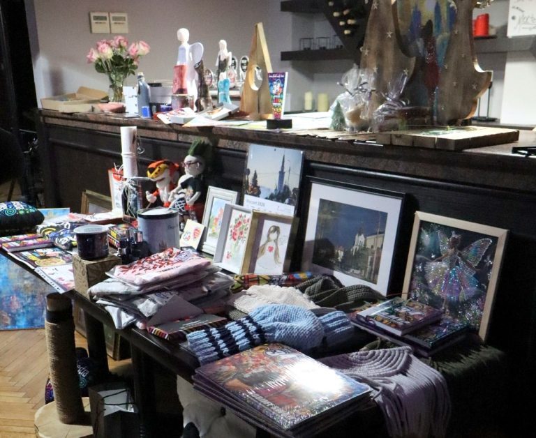 Wyroby pracowni ceramicznej MCKSiR Terespol (Marcelina Łozak-Łada i Anna Jakuszko): aniołki, kot, flakon, talerz, kubek, miska, patera.