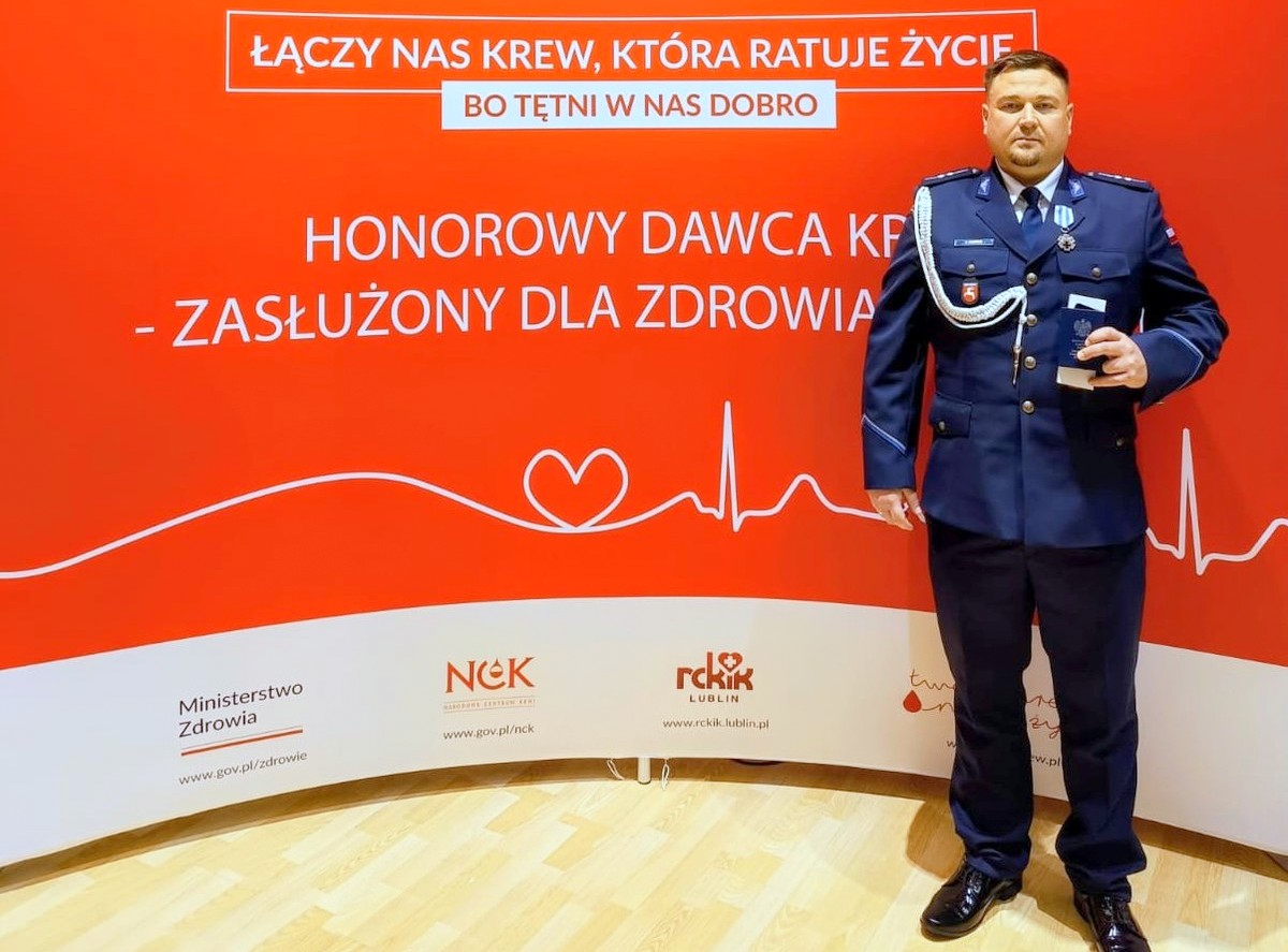 Aspirant Dariusz Romaniuk, dzielnicowy Komendy Miejskiej Policji w Białej Podlaskiej, który od ponad 20 lat dzieli się najcenniejszym darem, jakim jest krew, został uhonorowany odznaką “Honorowy Dawca Krwi – Zasłużony dla Zdrowia Narodu”. Łącznie dla ratowania zdrowia i życia innych oddał 22 litry i nie zamierza na tym poprzestać.