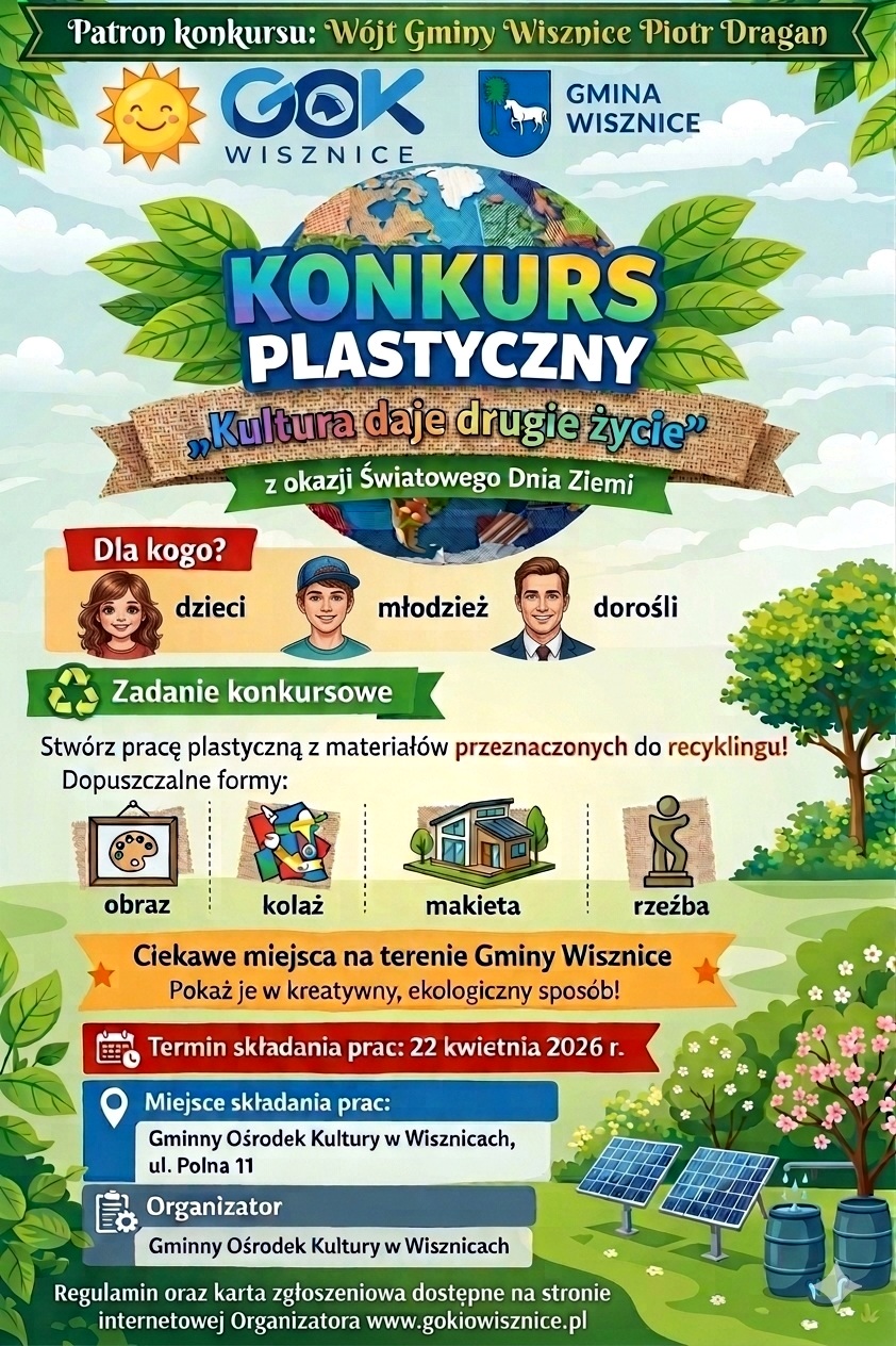 Nadchodzący Światowy Dzień Ziemi w gminie Wisznice nie będzie tylko datą w kalendarzu. Gminny Ośrodek Kultury i Oświaty rzuca wyzwanie wszystkim kreatywnym duszom: zamieńcie odpady w dzieła sztuki! Ruszył konkurs plastyczny „Kultura daje drugie życie”, który udowadnia, że recykling i lokalny patriotyzm mogą iść w parze.