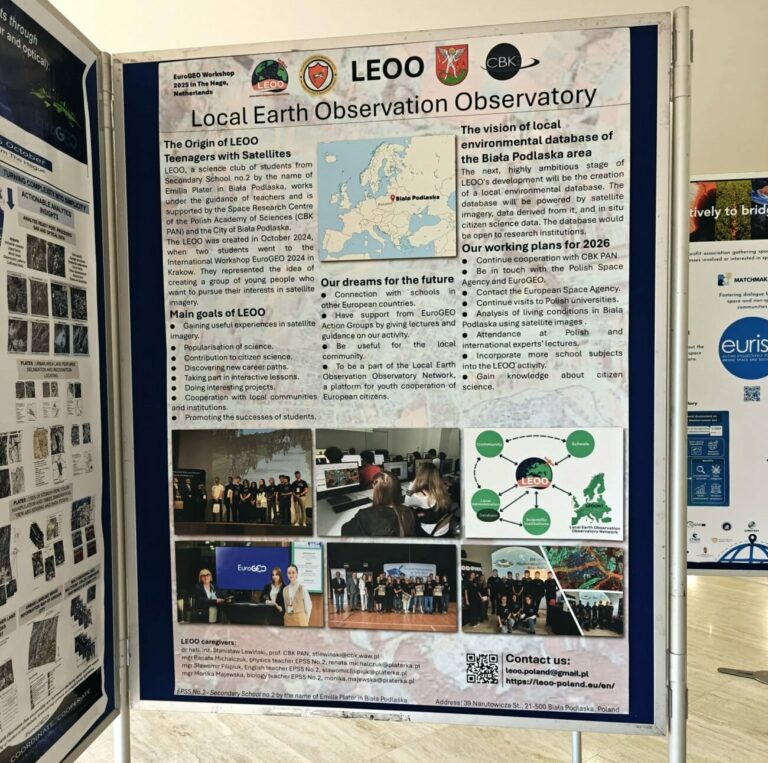 Koła naukowego LEOO (Local Earth Observation Observatory) z II Liceum Ogólnokształcącego im. E. Plater w Białej Podlaskiej reprezentowało miasto i szkołę podczas międzynarodowego wydarzenia EuroGEO Workshop 2025, które odbyło się w dniach 13-15 października w The Hague (Holandia), w obiekcie World Forum The Hague.