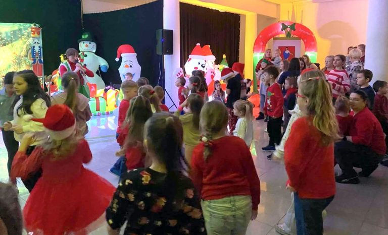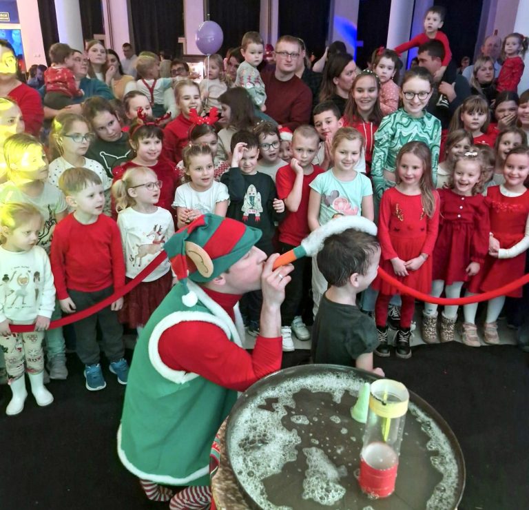 Harmonogram atrakcji tego dnia został szczelnie wypełniony. Świąteczne gry, zabawy oraz animacje przygotowane przez Niebanalne Animacje Happy Event wprowadziły dzieci w świetną zabawę. Ogromne wrażenie na uczestnikach wydarzenia zrobił pokaz dymiących baniek, wytwornica sztucznego śniegu oraz tańczący Olaf.