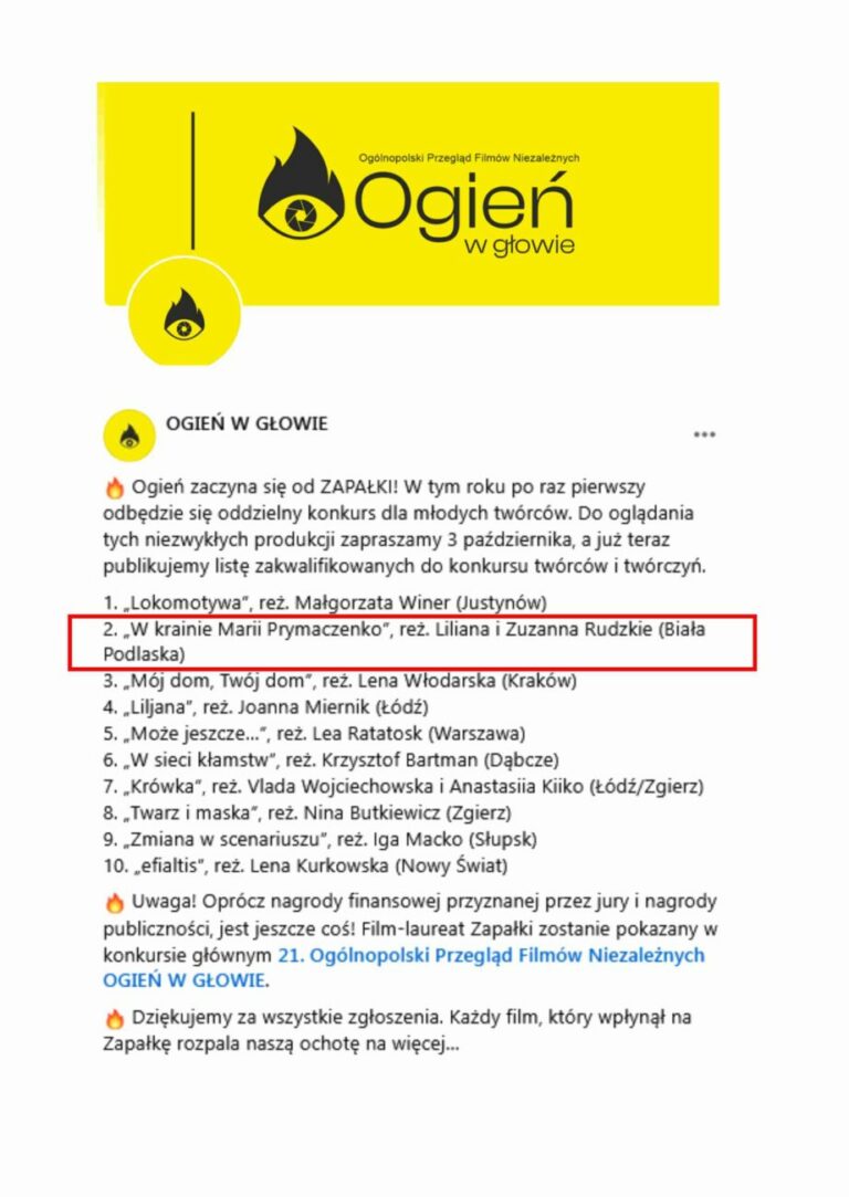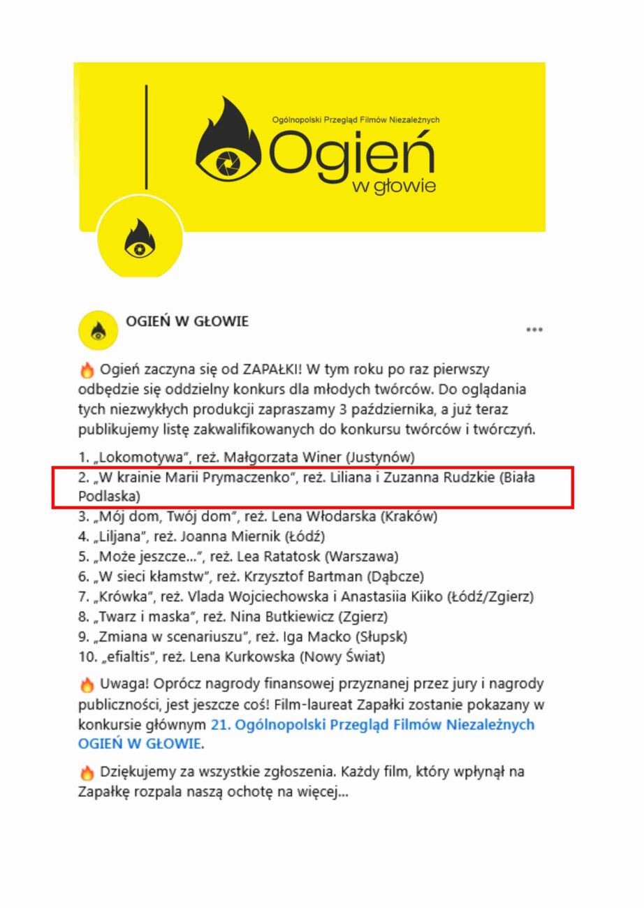 W ramach 21. edycji Ogólnopolskiego Przeglądu Filmów Niezależnych „Ogień w głowie 2025″, animacja autorstwa Lilianny i Zuzanny Rudzkich pt. „W krainie Marii Prymaczenko” została zakwalifikowana do finałowego pokazu w konkursie dla młodych filmowców (12-18 lat) pn. „Zapałka”. Oprócz nagrody finansowej, przyznanej przez jury i nagrody publiczności, film-laureat „Zapałki” zostanie pokazany w konkursie głównym 21. OPFN „Ogień w głowie”.
