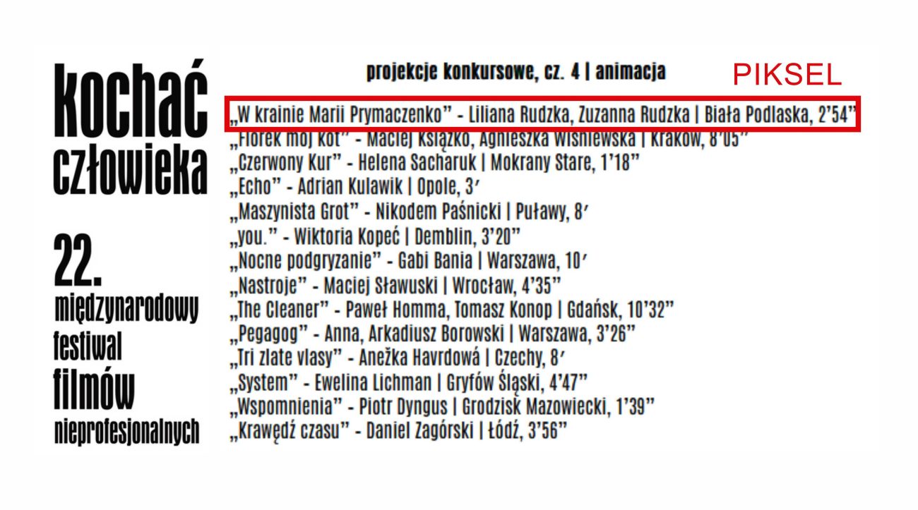 Spośród 108 filmów nadesłanych na 22. Międzynarodowy Festiwal Filmów Nieprofesjonalnych „Kochać człowieka” w Oświęcimiu, animacja „W krainie Marii Prymaczenko”, stworzona przez Liliannę i Zuzannę Rudzkie z Pracowni Grafiki Komputerowej Piksel z Bialskiego Centrum Kultury, znalazła się wśród 58 filmów zakwalifikowanych do projekcji konkursowych.