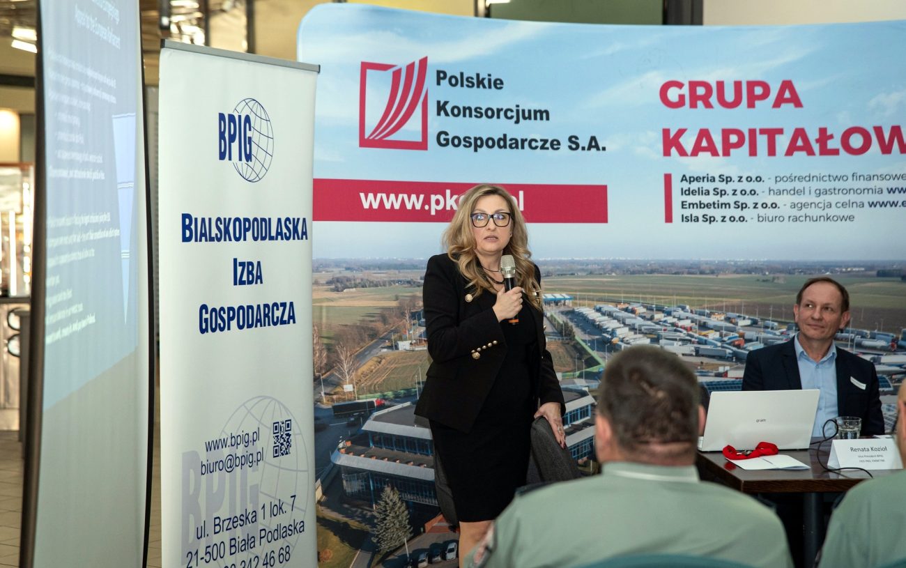 Spotkanie z delegacją, zorganizowane przez Bialskopodlaską Izbę Gospodarczą, odbyło się w poniedziałek 27 października w holu głównym Terminalu Samochodowego w Koroszczynie w gminie Terespol. Uczestniczyło w nim kilkunastu przedstawicieli lokalnego biznesu – członków BPIG. Spotkanie było okazją do bezpośredniej rozmowy o wyzwaniach, z jakimi mierzą się dziś branże transportowa, spedycyjna i logistyczna, ale też inne branże w naszym regionie.
