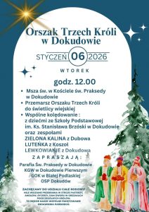 Już po raz trzeci w Dokudowie zorganizowany zostanie – we wtorek 6 stycznia – Orszak Trzech Króli. Po mszy św. odprawionej o godzinie 12 w kościele pw. świętej Praksedy w Dokudowie Pierwszym, orszak przemaszeruje do miejscowej świetlicy wiejskiej.