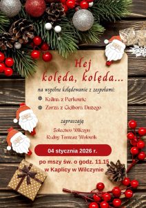 Pierwszym z nich będzie wspólne kolędowanie z zespołami Kalina z Perkowic i Zorza z Cicibora Dużego, pod hasłem „Hej kolęda, kolęda…”. Zapraszają na nie – w niedzielę 4 stycznia po mszy św. o godzinie 11.15 w kaplicy w Wilczynie – sołectwo Wilczyn oraz radny Tomasz Wołowik.