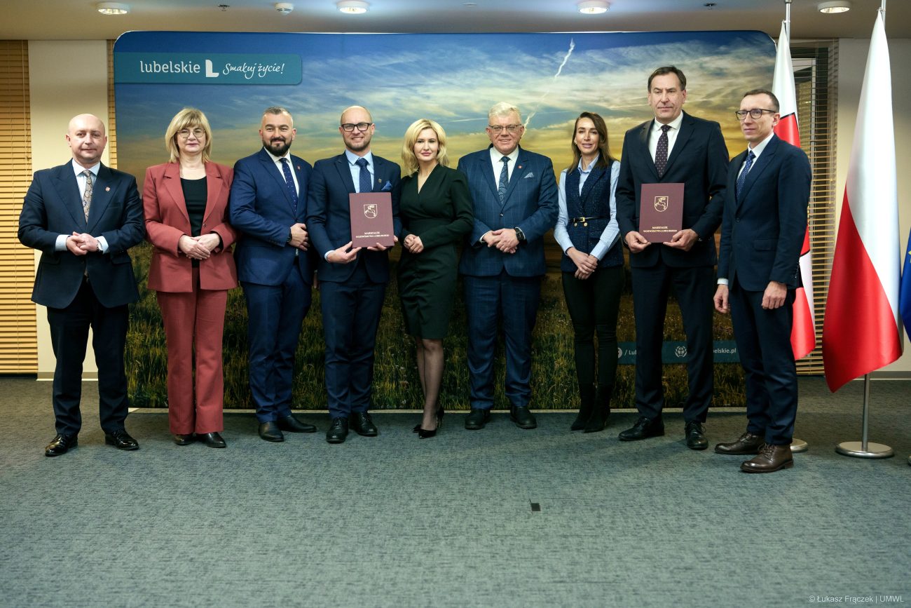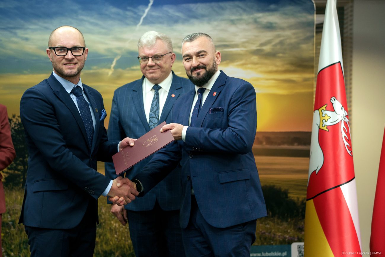 Wicemarszałek Piotr Breś i członek zarządu Jarosław Kwasek wręczyli dwie umowy na inwestycje w zrównoważoną gospodarkę wodno-ściekową na obszarach wiejskich. Beneficjentami są gminy Biała Podlaska i Stoczek Łukowski. Łączna wartość umów wyniosła prawie 10 mln zł.