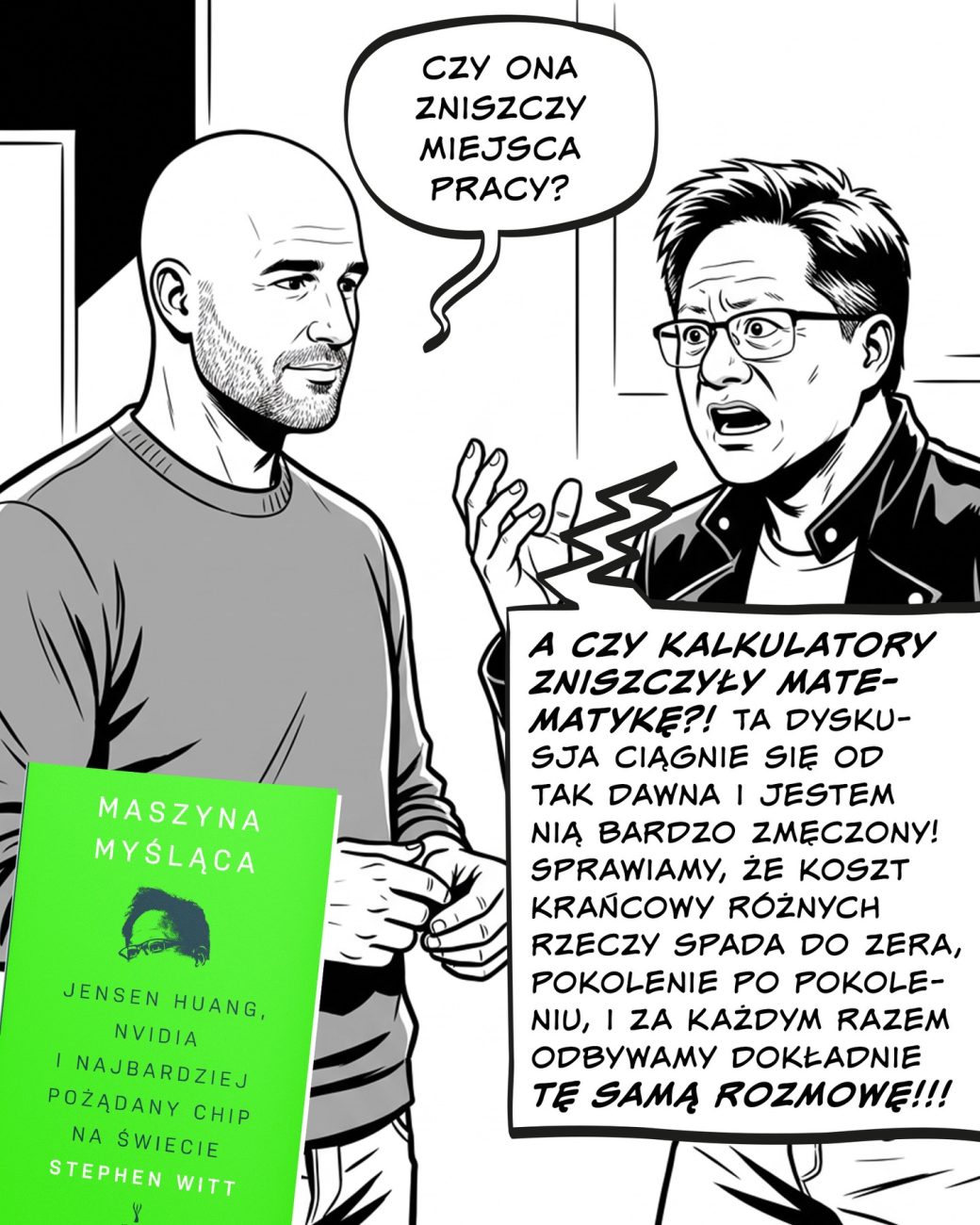 Witt stawia też trudne pytania o naszą przyszłość. Według Huanga żyjemy w erze „kolejnej rewolucji przemysłowej”. Chipy Nvidii to już nie tylko fotorealistyczna grafika w grach, ale fundament pod budowę autonomicznych robotów i systemów, które zmieniają definicję komputera.