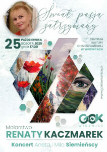 W najbliższą sobotę 25 października o godzinie 17 w Centrum Kultury Chrześcijańskiej przy ulicy Piotra Makaruka w Wisznicach uroczyście otwarta zostanie wystawa malarstwa Renaty Kaczmarek pt. „Świat pasją zatrzymany”. Wernisaż swoim występem uświetnią Aneta i Milo Siemieńscy.