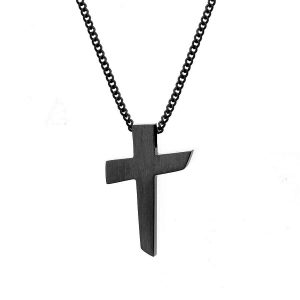 Jeśli szukasz modelu o niezwykle nowoczesnym charakterze, z całą pewnością warto zwrócić szczególną uwagę na satynowy krzyż w czarnym kolorze o niesymetrycznym kształcie. Krzyż został zawieszony na łańcuszku o długości 70 cm. To sprawia, że idealnie prezentuje się na męskim golfie, modnej koszulce czy wizytowej koszuli dobranej do garnituru.