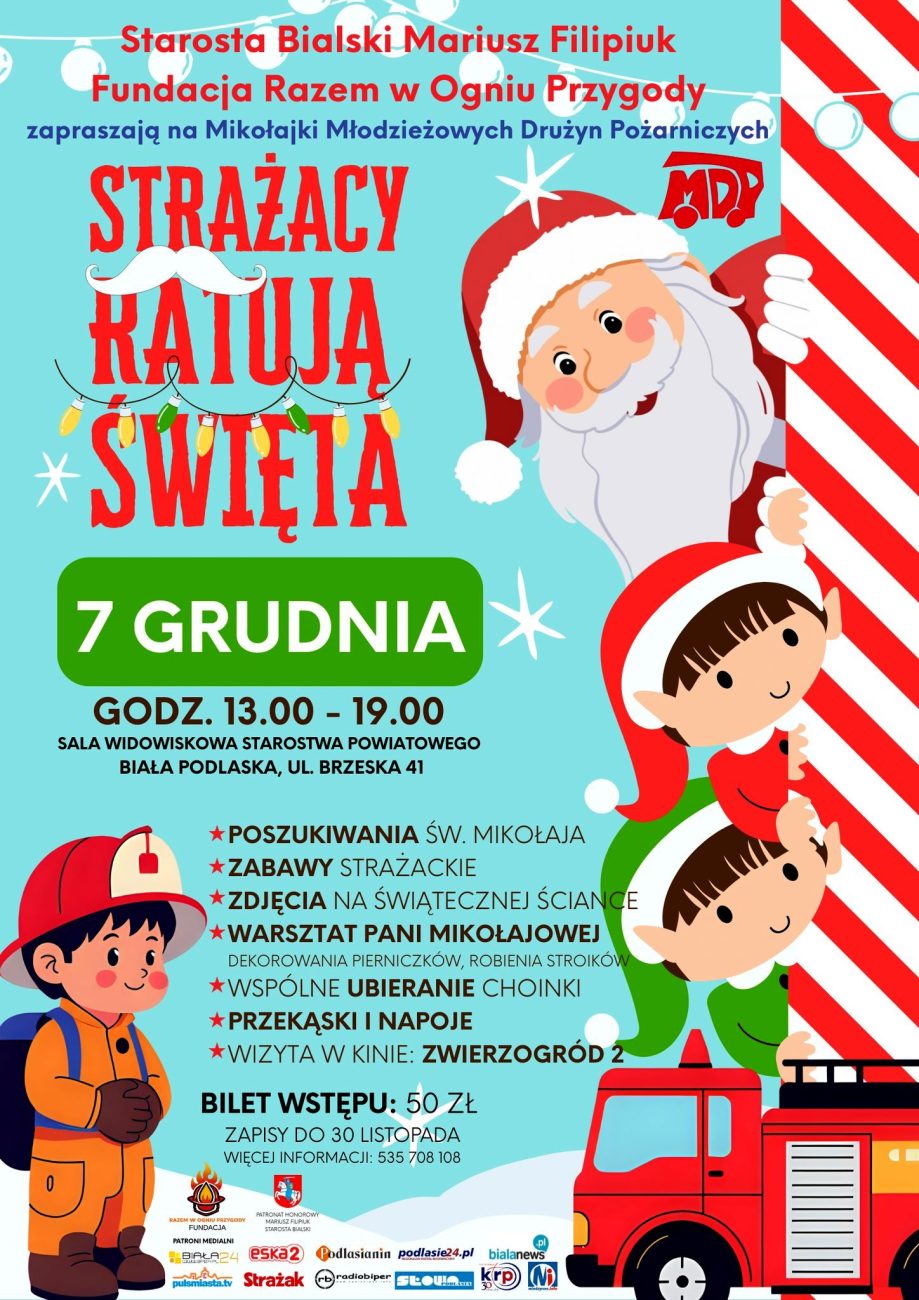 Uwaga, świąteczna misja ratunkowa w powiecie bialskim rozpoczęta! Dołącz do Młodzieżowych Drużyn Pożarniczych i pomóż im uratować Mikołajki! Starosta bialski Mariusz Filipiuk i Fundacja Razem w Ogniu Przygody zapraszają na superaktywne popołudnie pod hasłem „Strażacy ratują święta”.