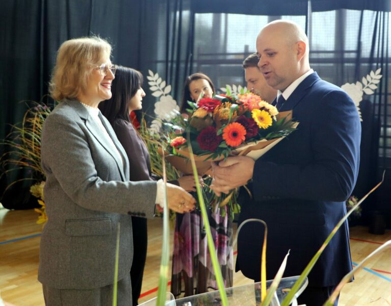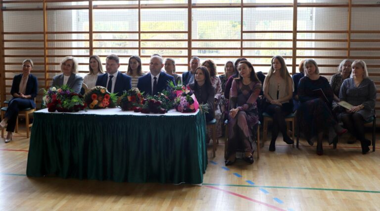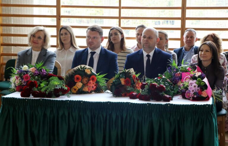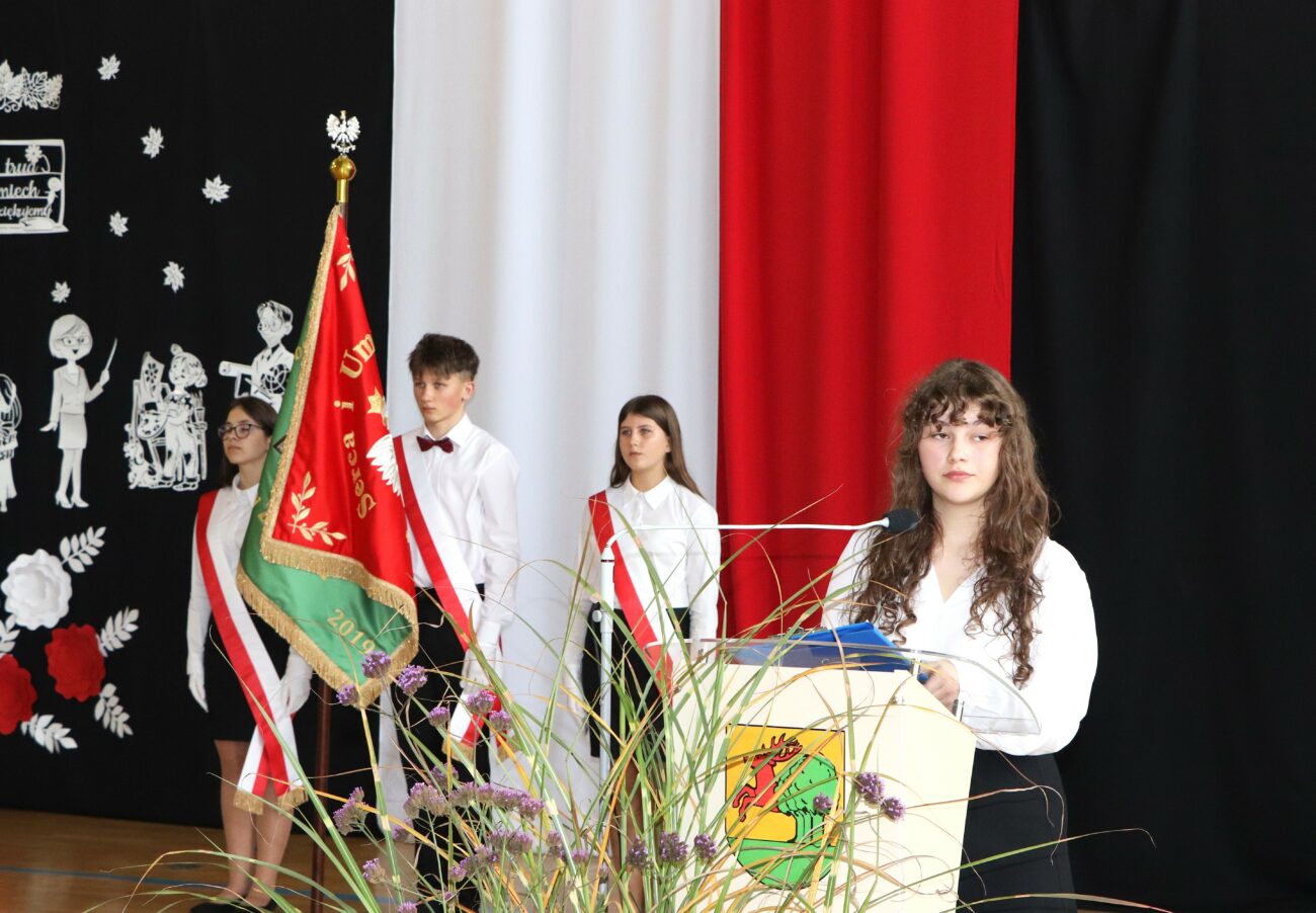 Następnie głos zabrał Tomasz Szewczyk, który podziękował dyrekcji oraz gronu pedagogicznemu za zaangażowanie, cierpliwość, charyzmę i oddanie, z jakimi wykonują swoje obowiązki każdego dnia. Docenił również współpracę szkoły z organem prowadzącym, dzięki której dzieci i młodzież z trenu gminy mogą zdobywać wiedzę, rozwijać swoje zainteresowania i talenty, spędzać aktywnie czas, otoczeni opieką i w przyjaznej atmosferze. W tym dniu wójt uhonorował nagrodami następujące osoby: dyrektor Teresę Kusiak, wicedyrektor szkoły Iwonę Jarmoszewicz, nauczyciela języka polskiego i opiekuna Samorządu Uczniowskiego Katarzynę Chreścionko.