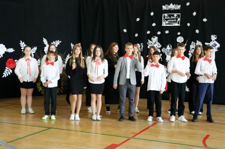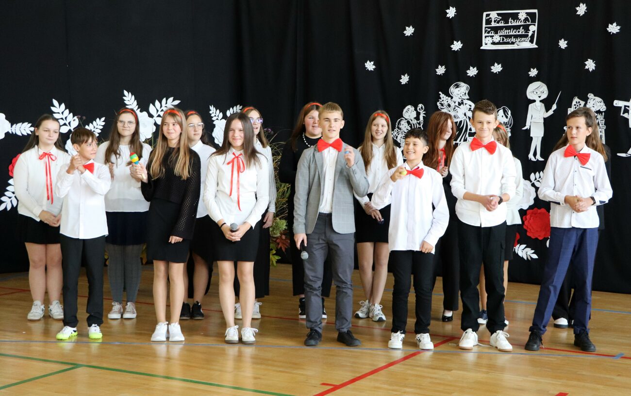 Zwieńczeniem szkolnych obchodów Dnia Edukacji Narodowej była część artystyczna, przygotowana przez uczniów klas siódmych pod kierunkiem wychowawców – Katarzyny Chreścionko i Doroty Prokopiuk. Młodzież słowami poezji oraz zaprezentowanych utworów muzycznych podziękowała swoim pedagogom za edukację, wychowanie oraz okazane wsparcie. Na koniec uroczystości uczniowie wręczyli im również symboliczne upominki.