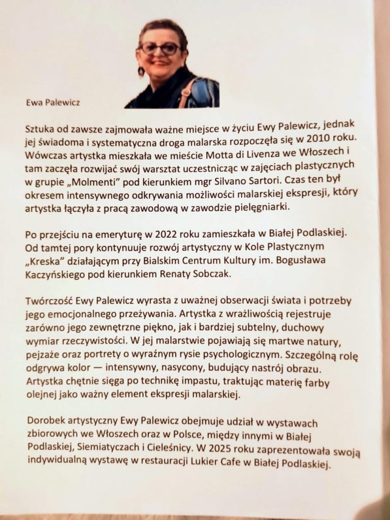 Choć Ewa Palewicz wystawiała swoje prace we Włoszech, Siemiatyczach czy Cieleśnicy, to właśnie obecna wystawa w Klubie Piast wydaje się być dla niej domknięciem pewnego etapu. To triumf pasji, która przetrwała próbę czasu i dziś staje się inspiracją dla innych, by nigdy nie rezygnować z marzeń.