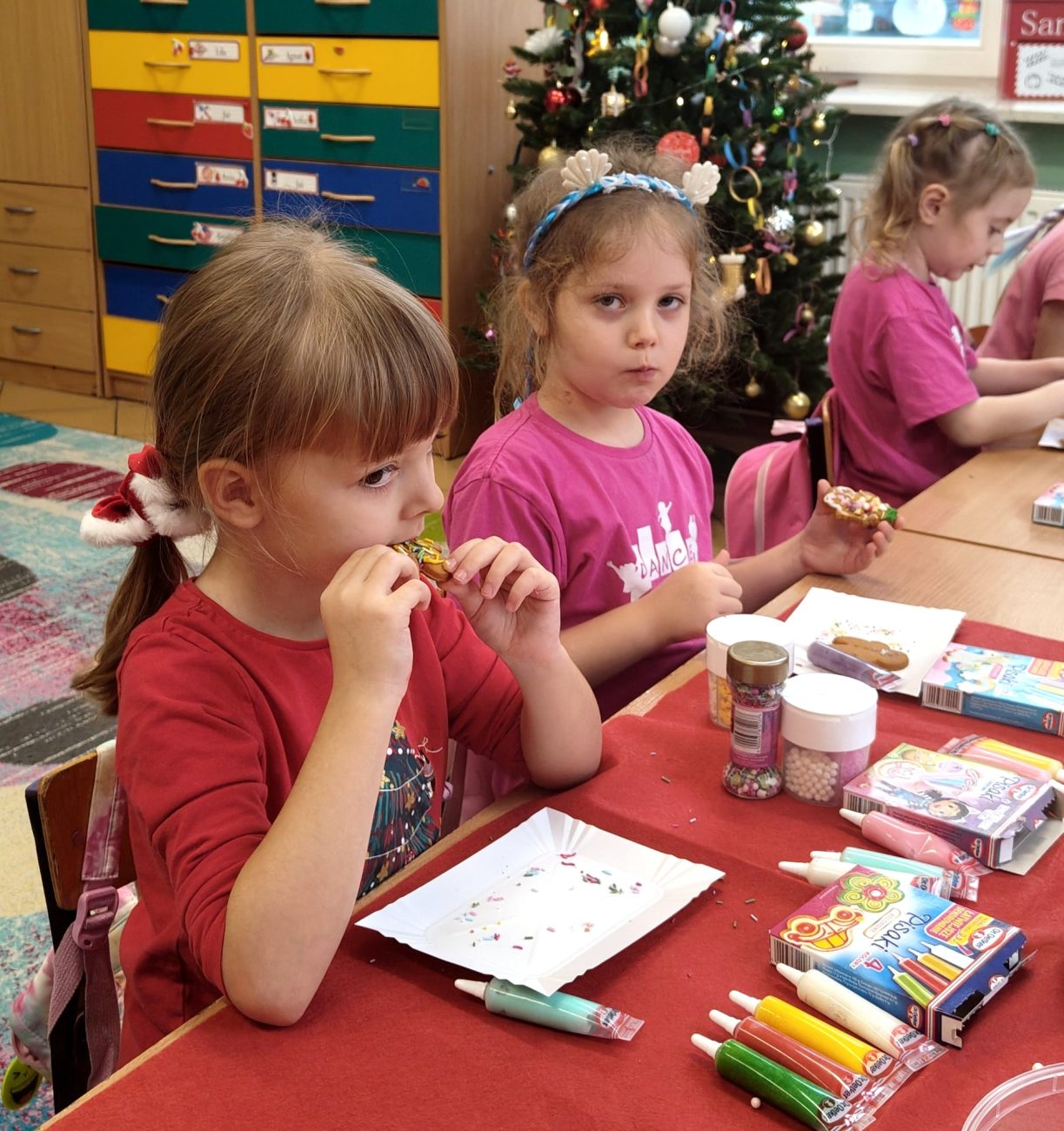 Od samego rana w sali zajęciowej panowała świąteczna atmosfera. Na stołach czekały na dzieci pierniczki, miseczki wypełnione kolorowymi lukrami, polewami, posypkami, perełkami i innymi jadalnymi dekoracjami. Przedszkolaki z wielkim entuzjazmem zabrały się do pracy, a ich pomysłowość i kreatywność zachwycały na każdym kroku. Każdy pierniczek stawał się małym arcydziełem – ozdobionym z niezwykłą starannością, fantazją i dziecięcą radością.
