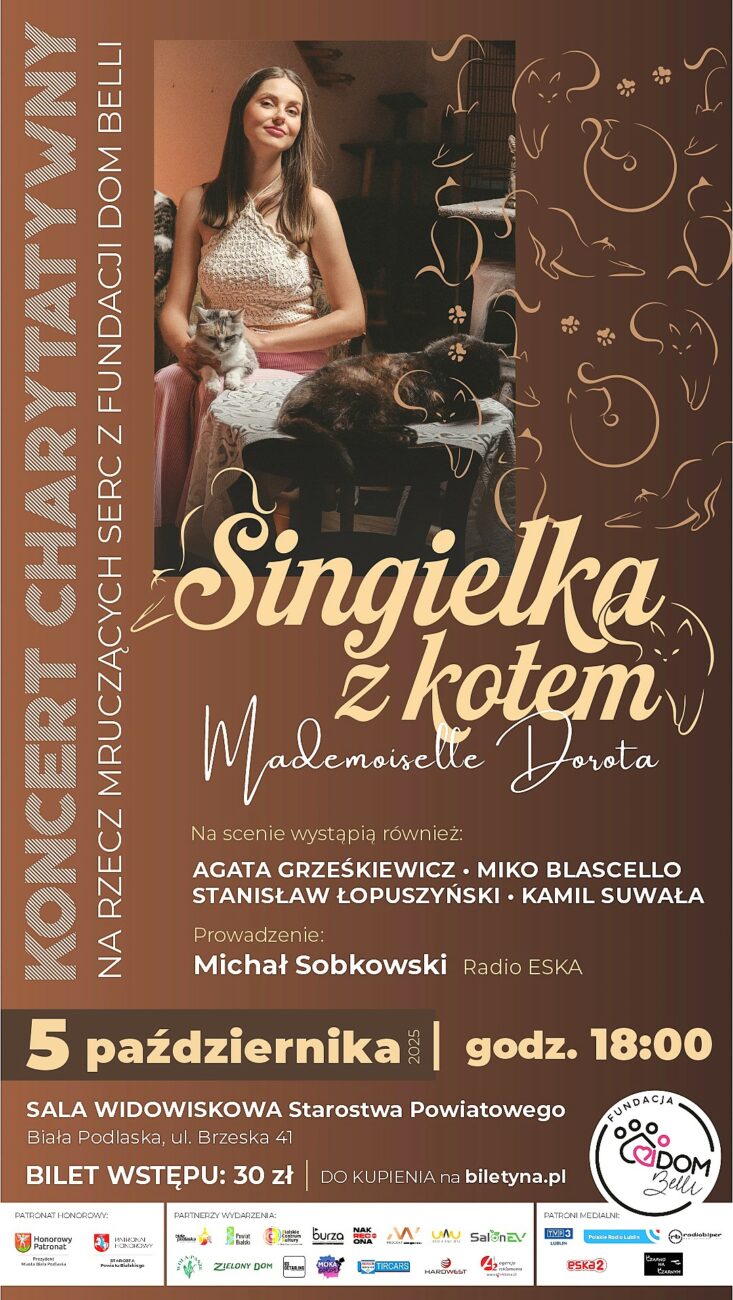 Koncert charytatywny „Singielka z kotem” to wyjątkowe wydarzenie muzyczne, które łączy sztukę, wrażliwość i realną pomoc. Pomysłodawczyniami projektu są wokalistka i autorka piosenek Mademoiselle Dorota (Dorota Sacewicz) oraz prezeska Fundacji Dom Belli w Białej Podlaskiej Iza Kunicka, która od lat ratuje i otacza opieką bezdomne koty w regionie.