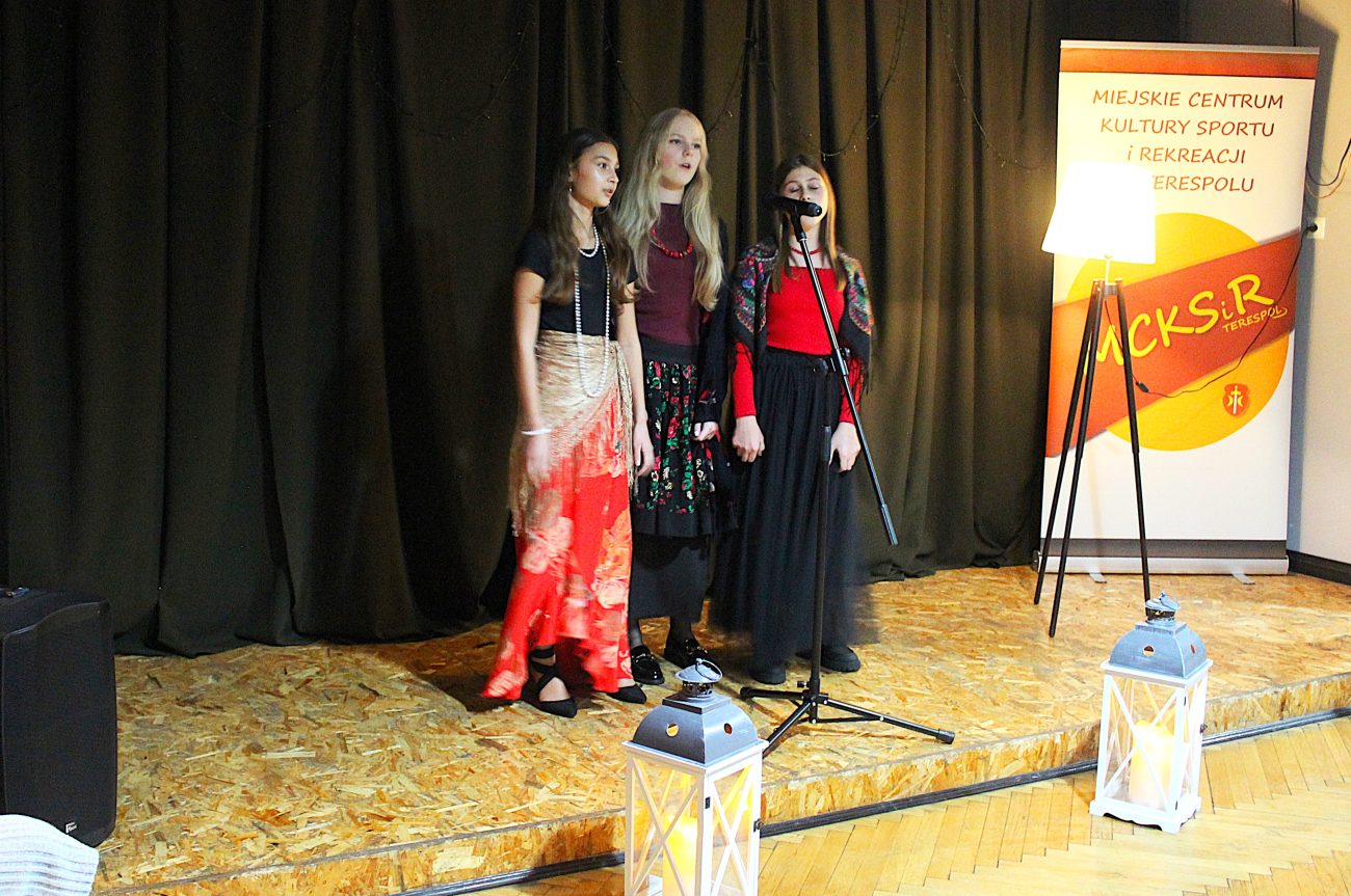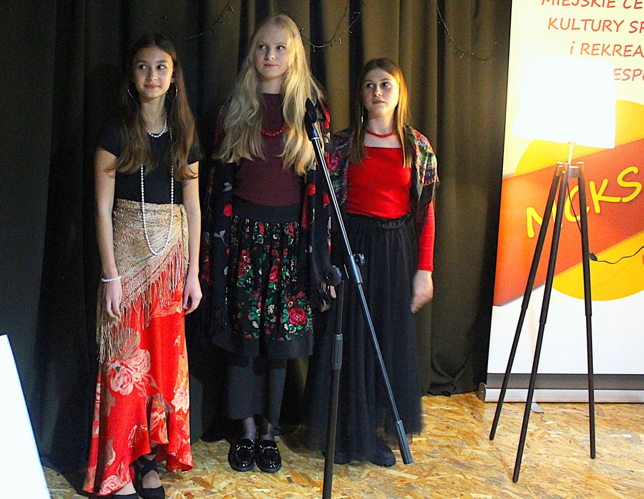 Spotkanie rozpoczęły uczestniczki zajęć wokalnych: Maja Siczek, Nikola Bielak i Amelia Lewczuk, które zaśpiewały dwa utwory wprowadzające w klimat spotkania: „Jadą wozy kolorowe” i „Kolorowe jarmarki”.