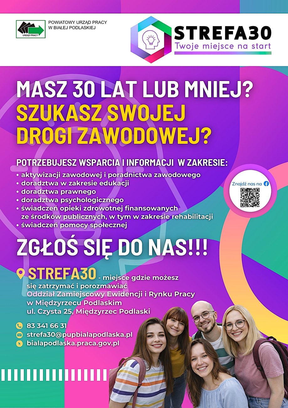 Powiatowy Urząd Pracy w Białej Podlaskiej otwiera w Oddziale Zamiejscowym Ewidencji i Rynku Pracy w Międzyrzecu Podlaskim punkt obsługi osób do 30. roku życia „STREFA30 – Twoje miejsce na start”. Jest to miejsce stworzone z myślą o młodych osobach, stojących przed decyzjami edukacyjnymi, zawodowymi i życiowymi. Uroczyste otwarcie odbędzie się w piątek 27 lutego 2026 roku, zaś swoje funkcjonowanie rozpocznie od marca 2026 roku.