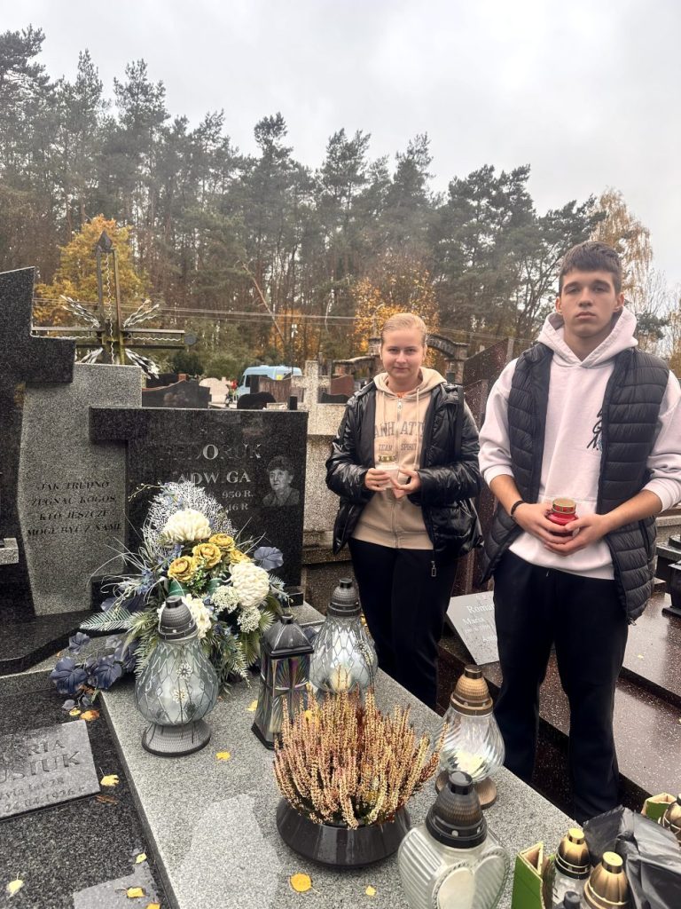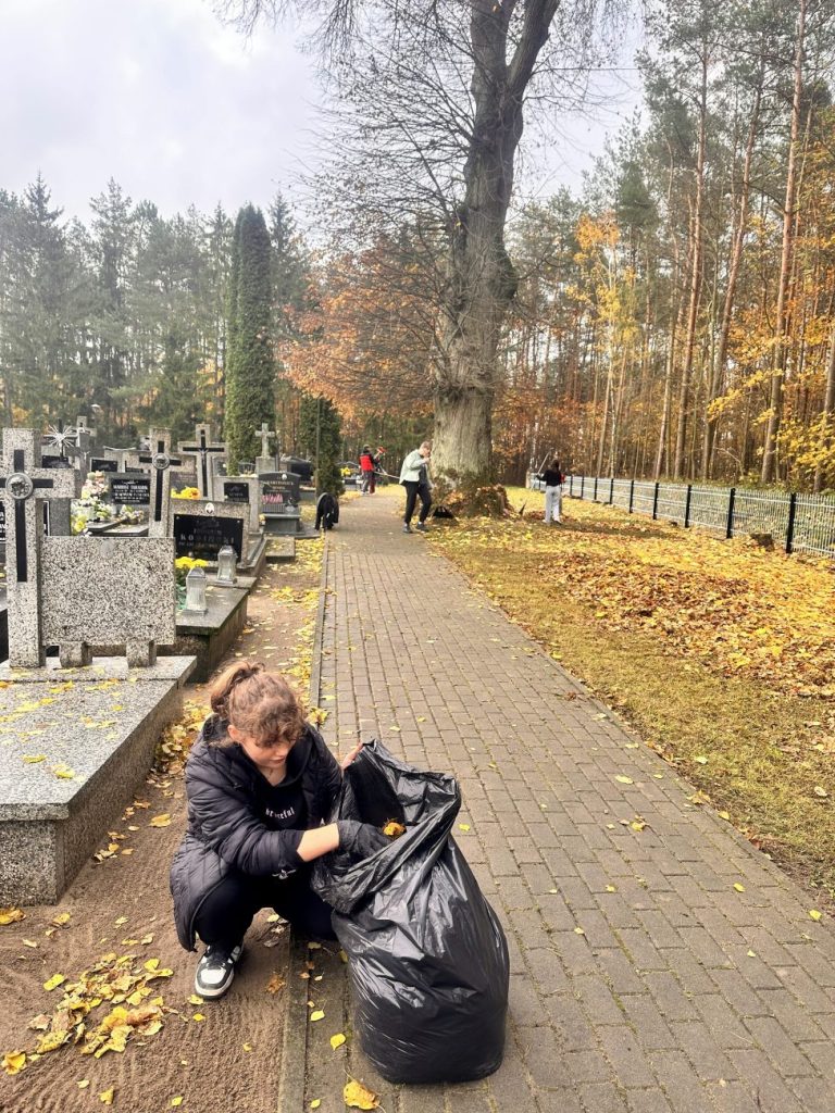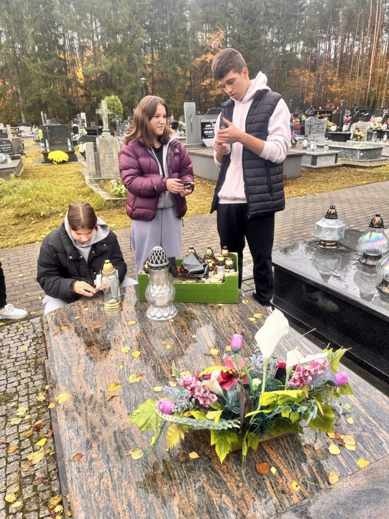 Działania te miały na celu nie tylko uporządkowanie grobów, ale także były wyrazem szacunku i pamięci o tych, którzy odeszli. Uczniowie z zaangażowaniem i troską sprzątali zaniedbane zakątki cmentarza, usuwając liście i śmieci oraz dbając o estetykę tego miejsca. W ramach akcji uczniowie zapalili symboliczne „światełka pamięci” na grobach zmarłych nauczycieli, pracowników szkoły, znanych osób ze środowiska lokalnego oraz na grobach opuszczonych, które potrzebują naszej troski i pamięci.