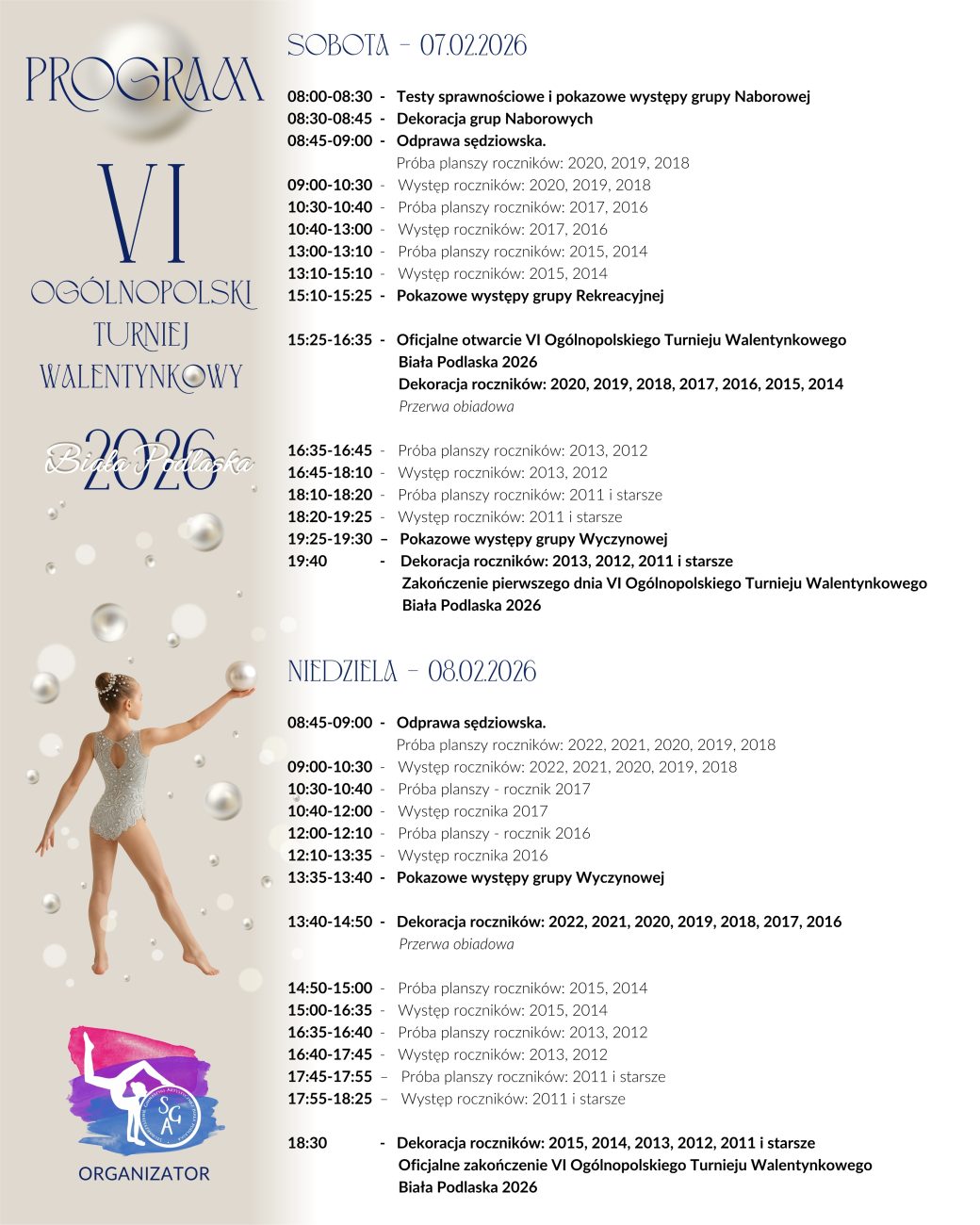 Turniej Walentynkowy to nie tylko sportowa rywalizacja o medale, ale przede wszystkim wspaniałe widowisko dla mieszkańców Białej Podlaskiej i okolic. Muzyka, profesjonalna choreografia i kunszt młodych zawodniczek tworzą atmosferę, obok której trudno przejść obojętnie.