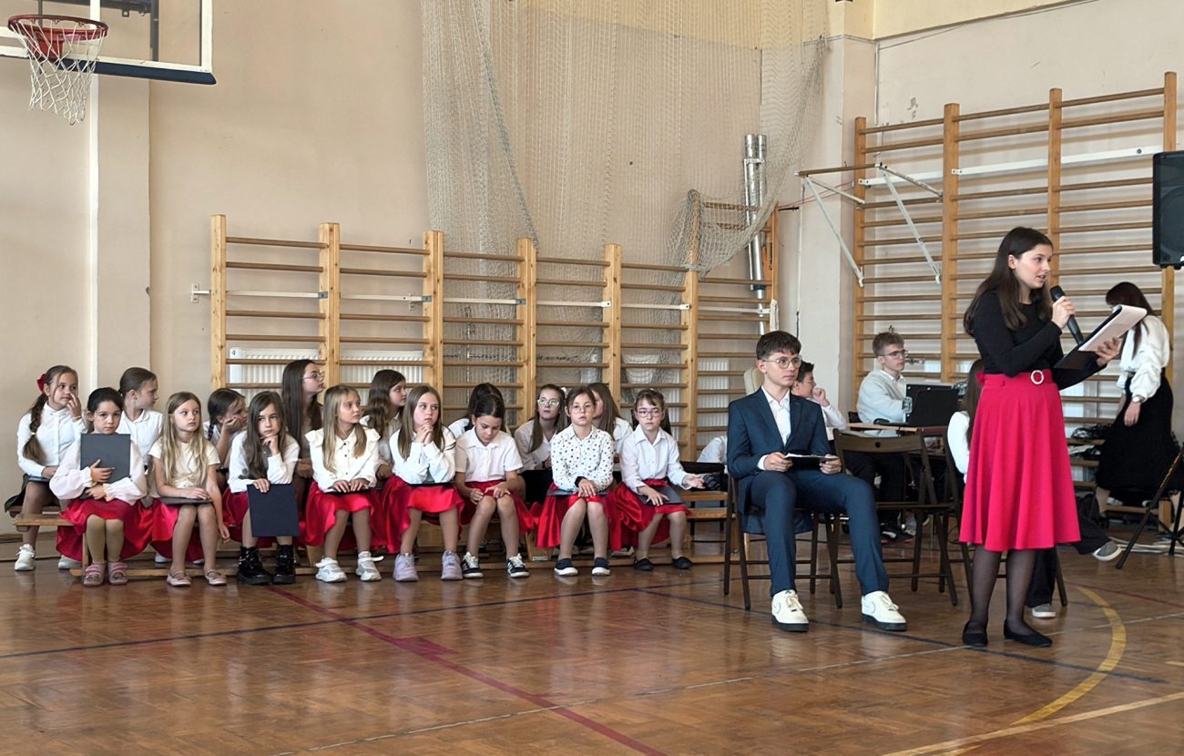 Dziewczęta z klas VI I VII zaprezentowały piękny taniec z biało-czerwonymi flagami, a chór zaśpiewał patriotyczne piosenki, które wprowadziły wszystkich w wyjątkowy nastrój.