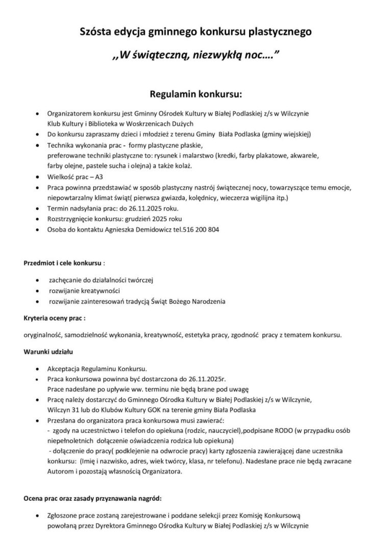 Termin składania prac: od 17 listopada do 26 listopada (godzina 15), w Gminnym Ośrodku Kultury z siedzibą w Wilczynie (Wilczyn 31) lub do Klubów Kultury i bibliotek GOK na terenie gminy Biała Podlaska. Rozstrzygnięcie konkursu nastąpi w grudniu.