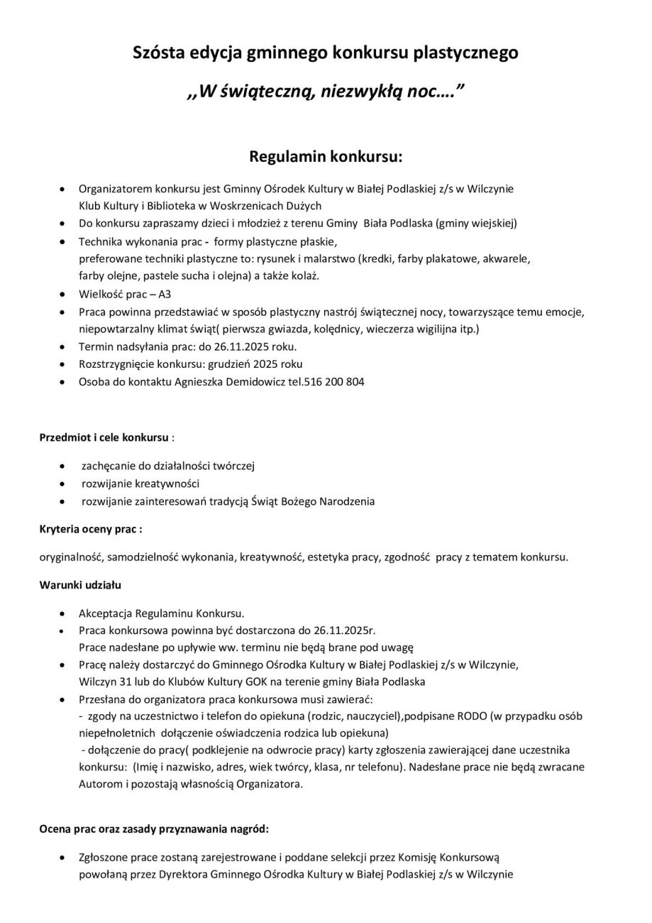 Już po raz szósty organizowany jest konkurs plastyczny „W świąteczną niezwykłą noc”. Gminny Ośrodek Kultury w Białej Podlaskiej z siedzibą w Wilczynie zaprasza do udziału dzieci i młodzież z gminy Biała Podlaska.