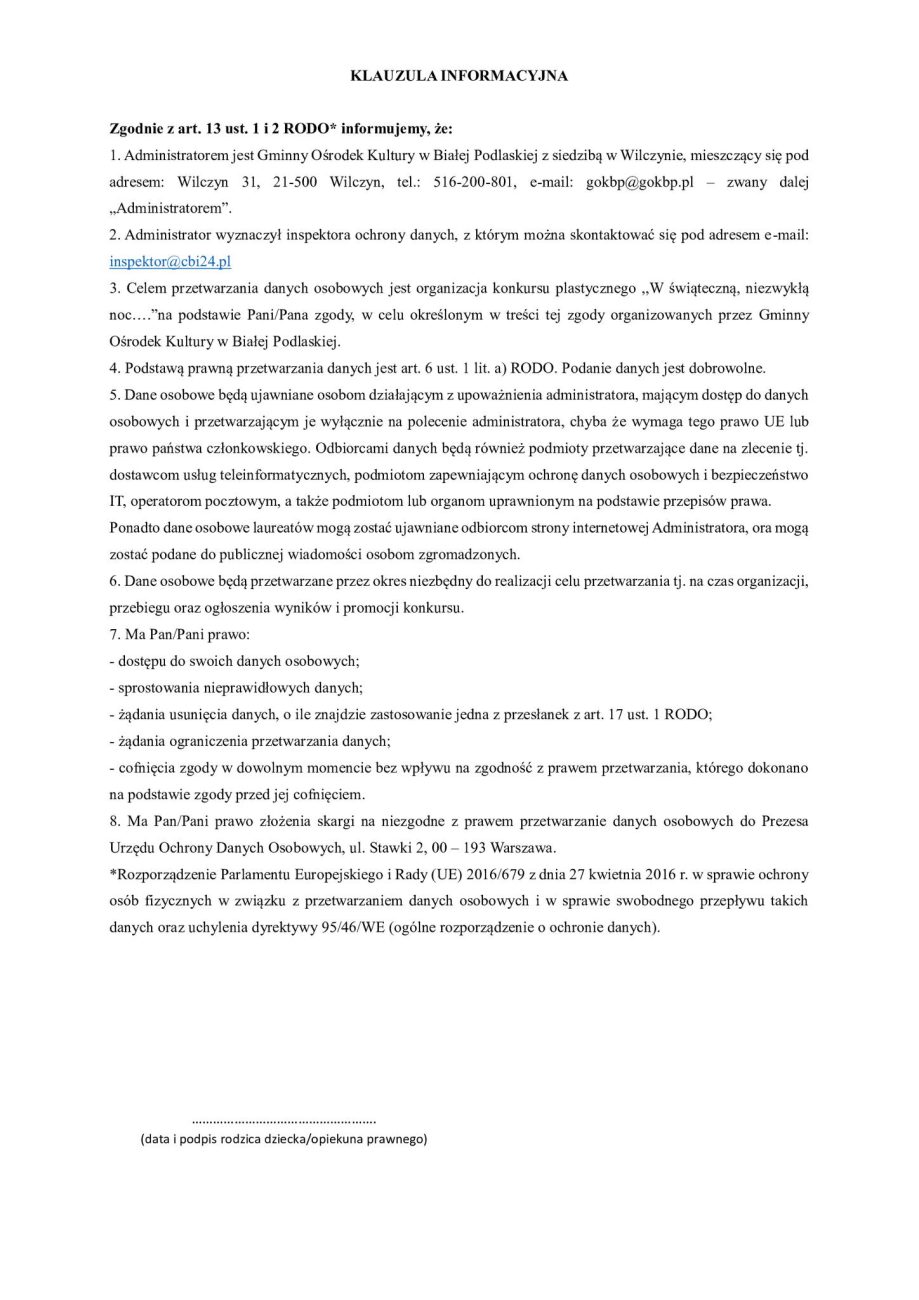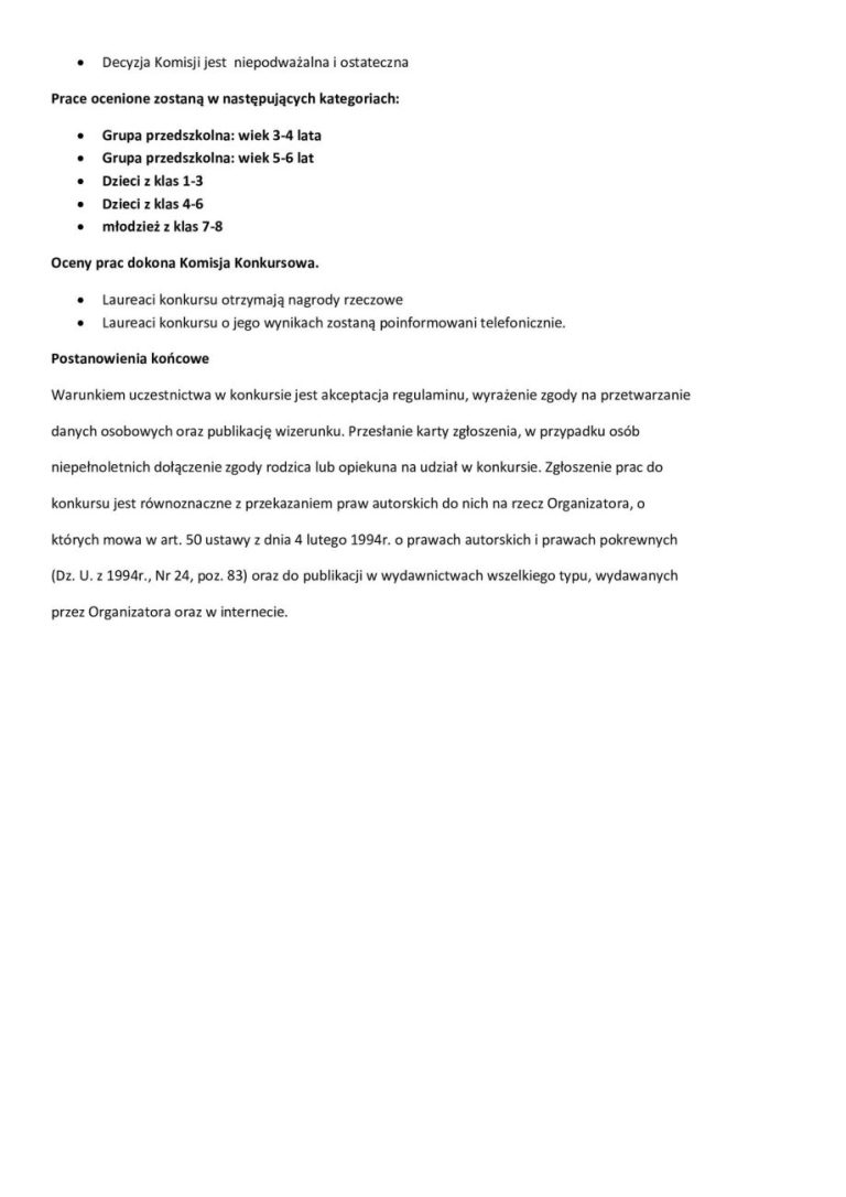 Przesłana do organizatora praca konkursowa musi zawierać: * zgody na uczestnictwo i telefon do opiekuna (rodzic, nauczyciel), podpisane RODO (w przypadku osób niepełnoletnich dołączenie oświadczenia rodzica lub opiekuna); * dołączenie do pracy (podklejenie na odwrocie pracy) karty zgłoszenia, zawierającej dane uczestnika konkursu: imię i nazwisko, adres, wiek twórcy, numer telefonu. Nadesłane prace nie będą zwracane autorom.