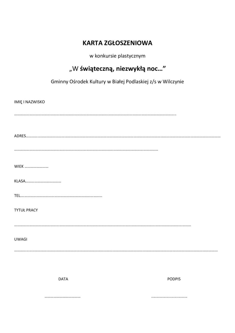 Zadaniem uczestników 6. Konkursu plastycznego „W świąteczną niezwykłą noc” jest wykonanie pracy przedstawiającej w sposób plastyczny nastrój świątecznej nocy, towarzyszące temu emocje, niepowtarzalny klimat świąt (pierwsza gwiazda, kolędnicy, wieczerza wigilijna itp.).