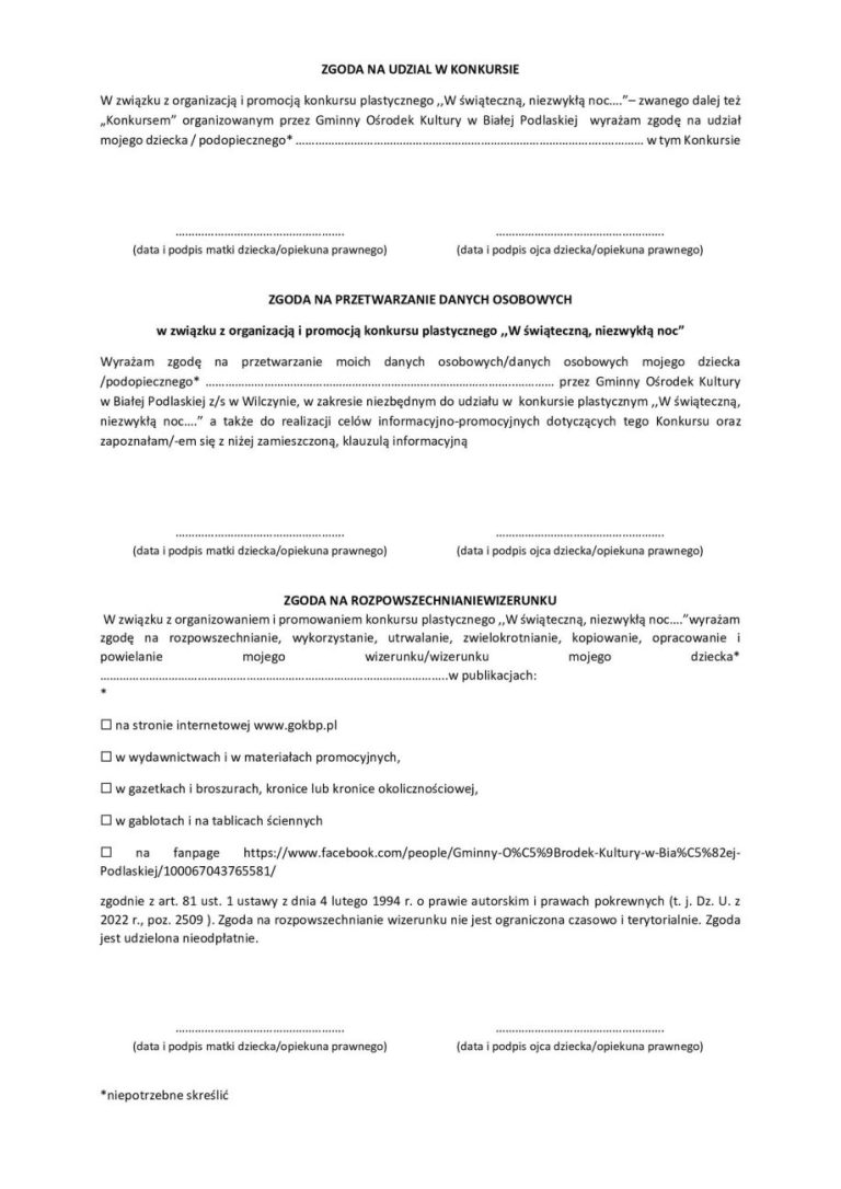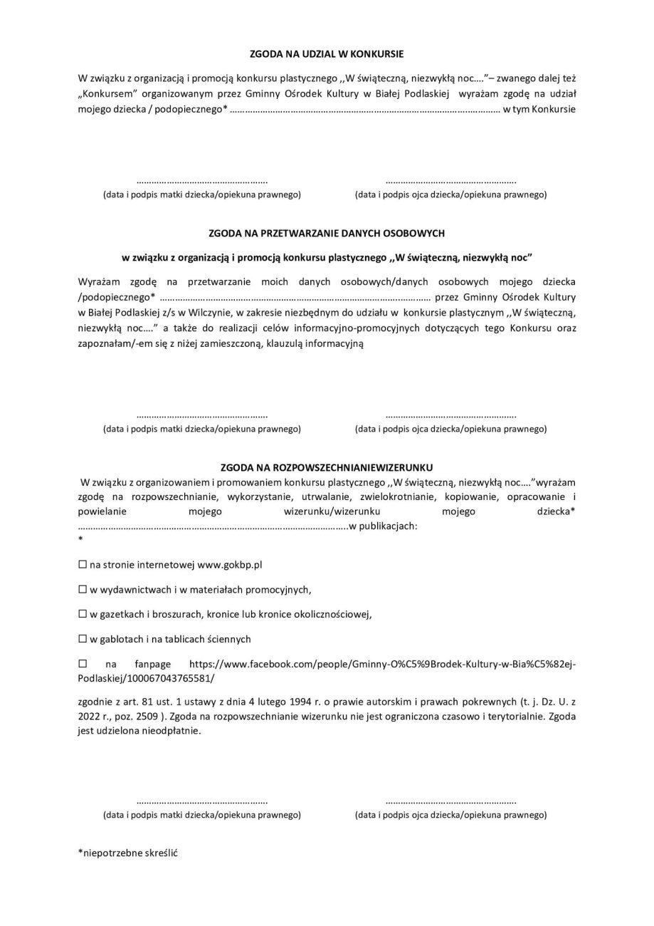 Poniżej załączamy do pobrania regulamin konkursu, kartę zgłoszeniową oraz zgody, które uczestnicy powinni wydrukować i wypełnić: