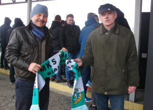 W przerwie meczu Podlasia z Unią Tarnów (2018 r.) ówczesny prezes Podlasia Zbigniew Barszcz wręczył Stanisławowi Kulgawczukowi klubowy szalik (fot. Roman Laszuk)
