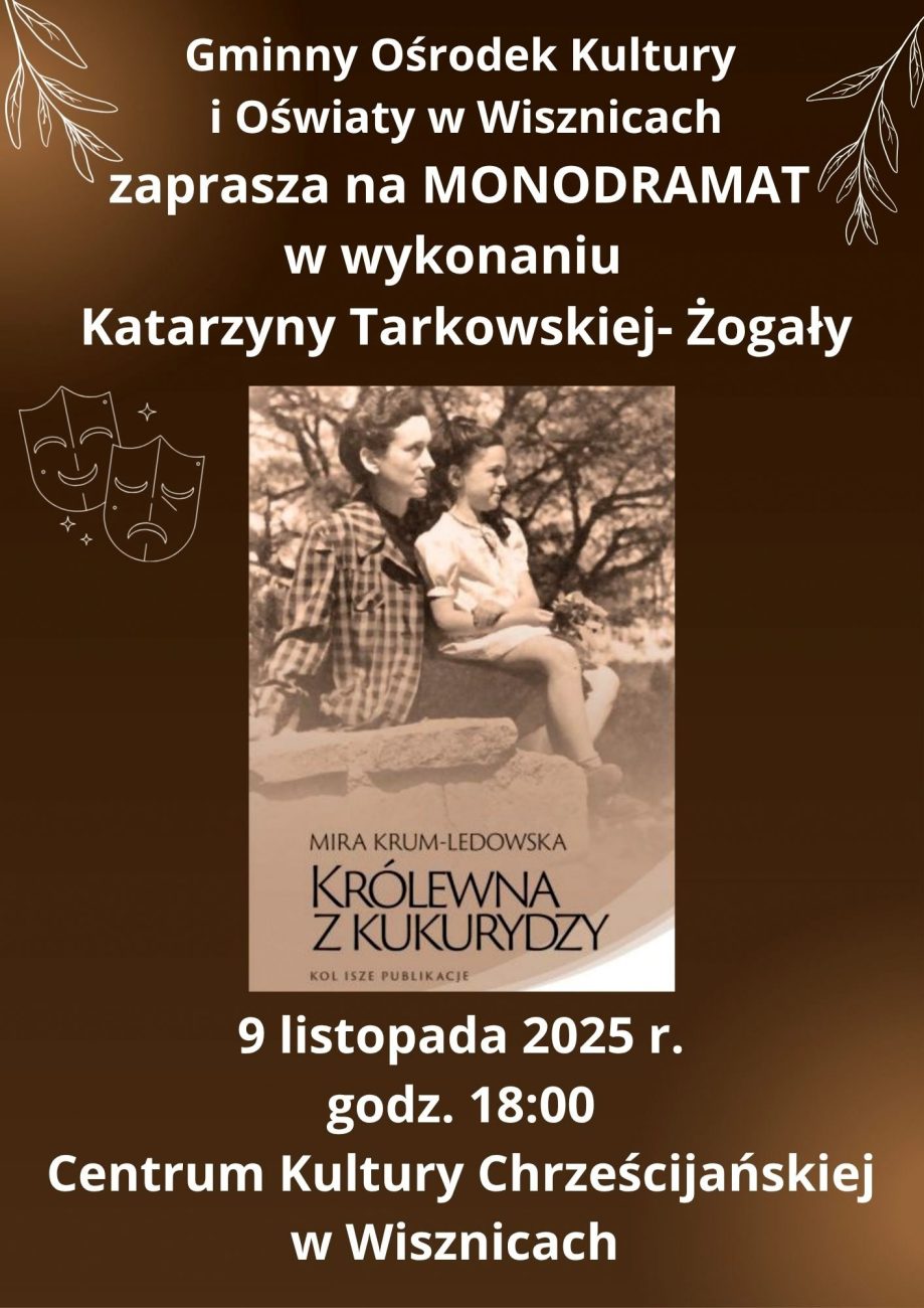 Gminny Ośrodek Kultury i Oświaty w Wisznicach zaprasza w niedzielę 9 listopada do Centrum Kultury Chrześcijańskiej przy ulicy Piotra Makaruka na monodramat „Królewna z kukurydzy”, w wykonaniu Katarzyny Tarkowskiej-Żogały. Scenariusz powstał na motywach niezwykłych wspomnień kobiety, która jako dziewczynka przetrwała holocaust, dzięki ofiarności i poświęceniu wielu polskich rodzin.