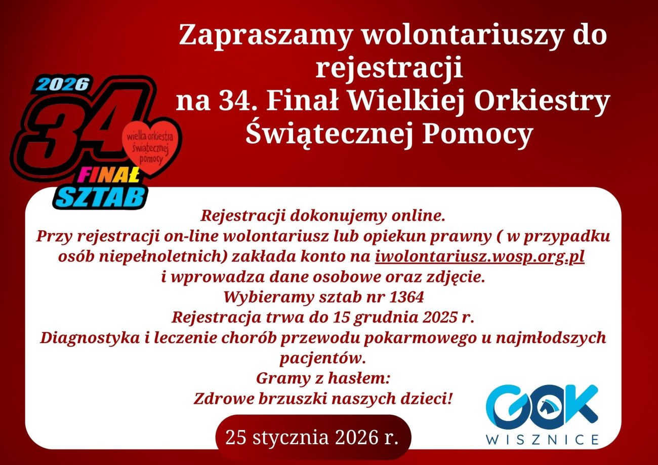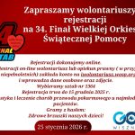 Do poniedziałku 15 grudnia trwa rejestracja wolontariuszy do 34. Finału Wielkiej Orkiestry Świątecznej Pomocy 2026. Gorąco zachęca do tego Gminny Ośrodek Kultury i Oświaty w Wisznicach.