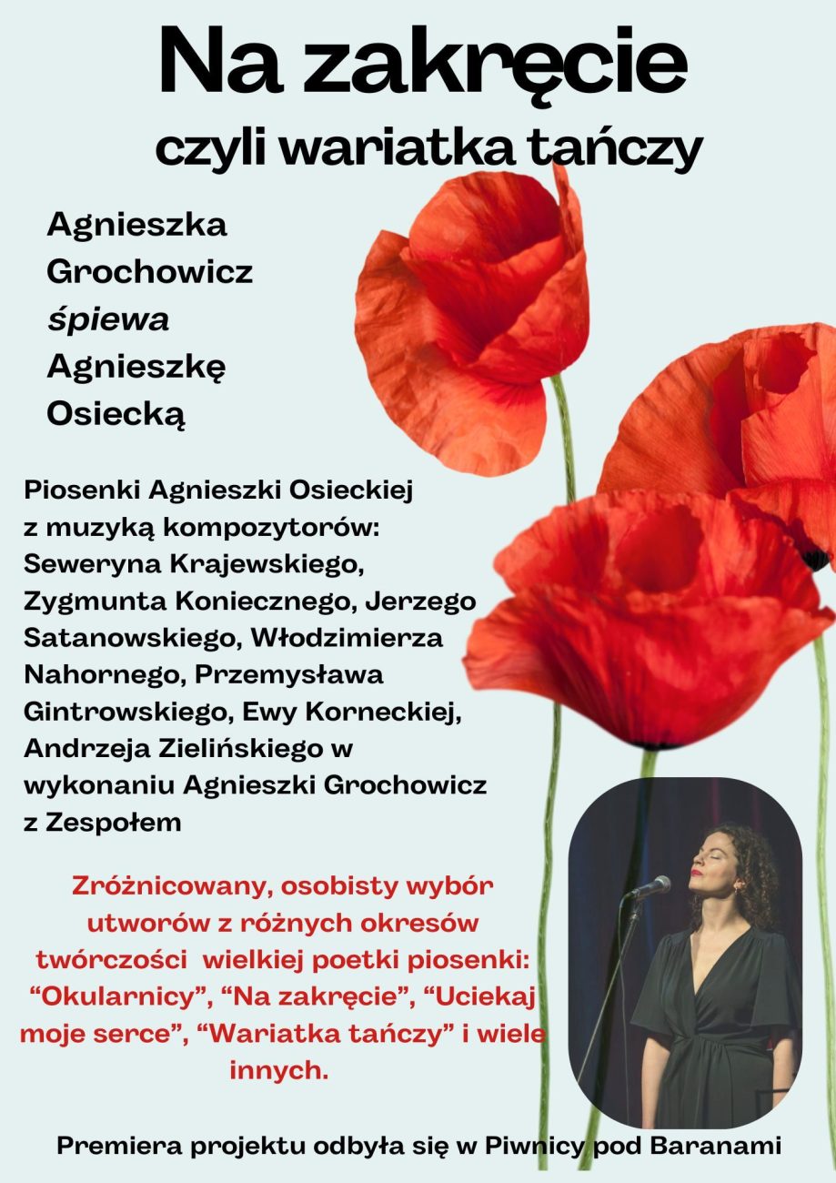 Gwiazdą wieczoru będzie Agnieszka Grochowicz – wokalistka, autorka tekstów i artystka sceniczna. Jej koncert w całości poświęcony będzie twórczości Agnieszki Osieckiej, jednej z największych poetek polskiej piosenki.